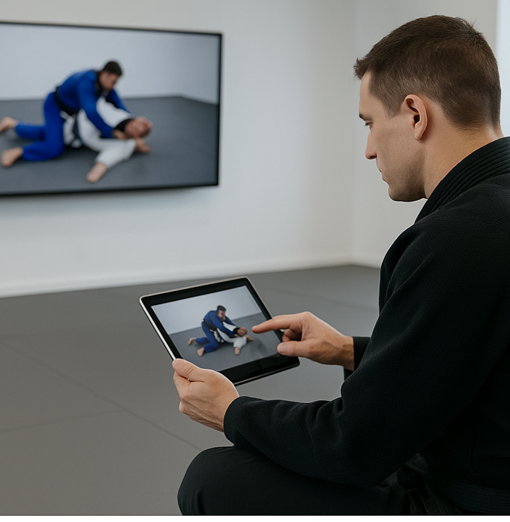 Vídeos de técnicas e aulas ficam disponíveis para os alunos assistirem a qualquer momento, complementando o treinamento.